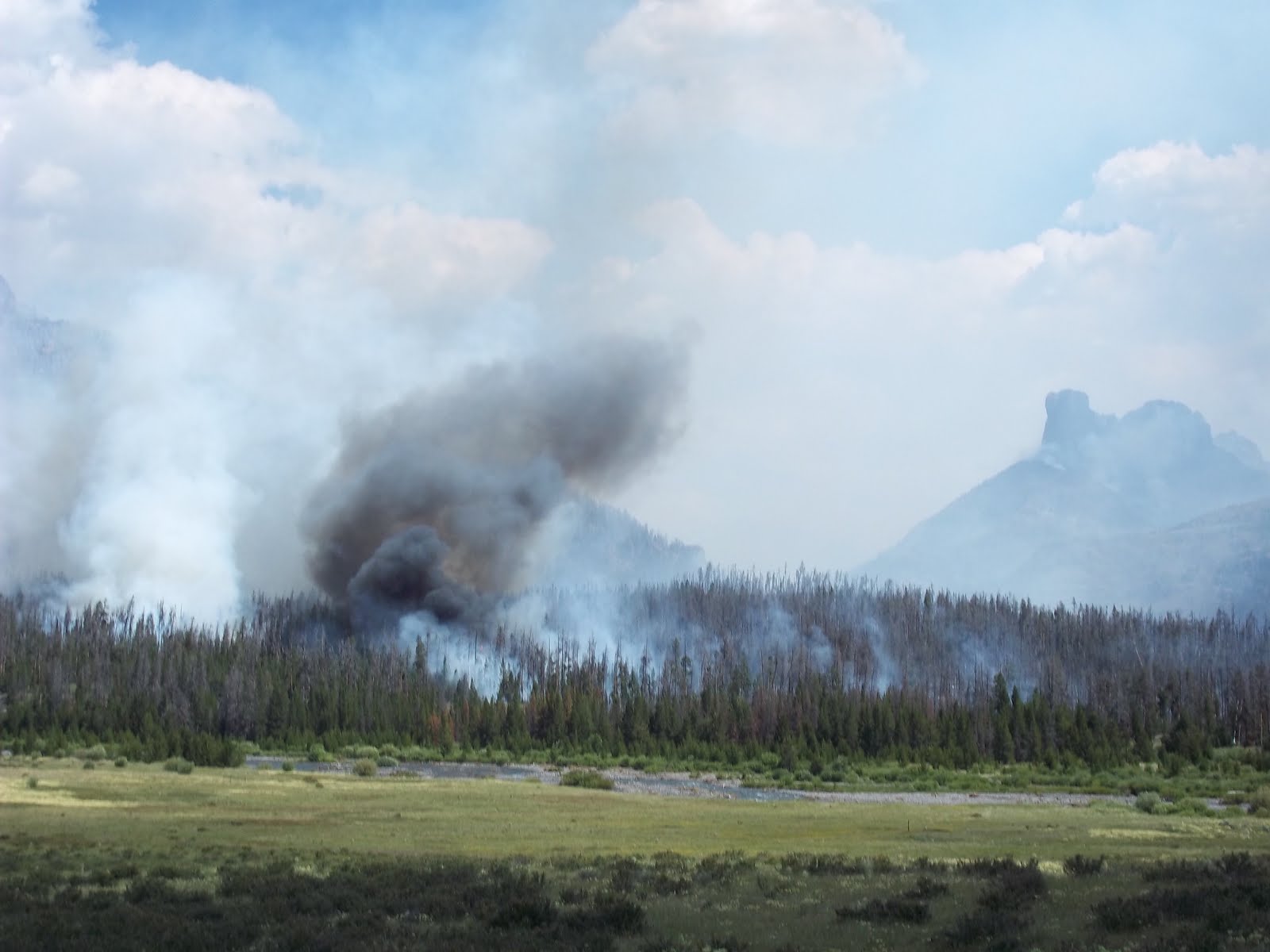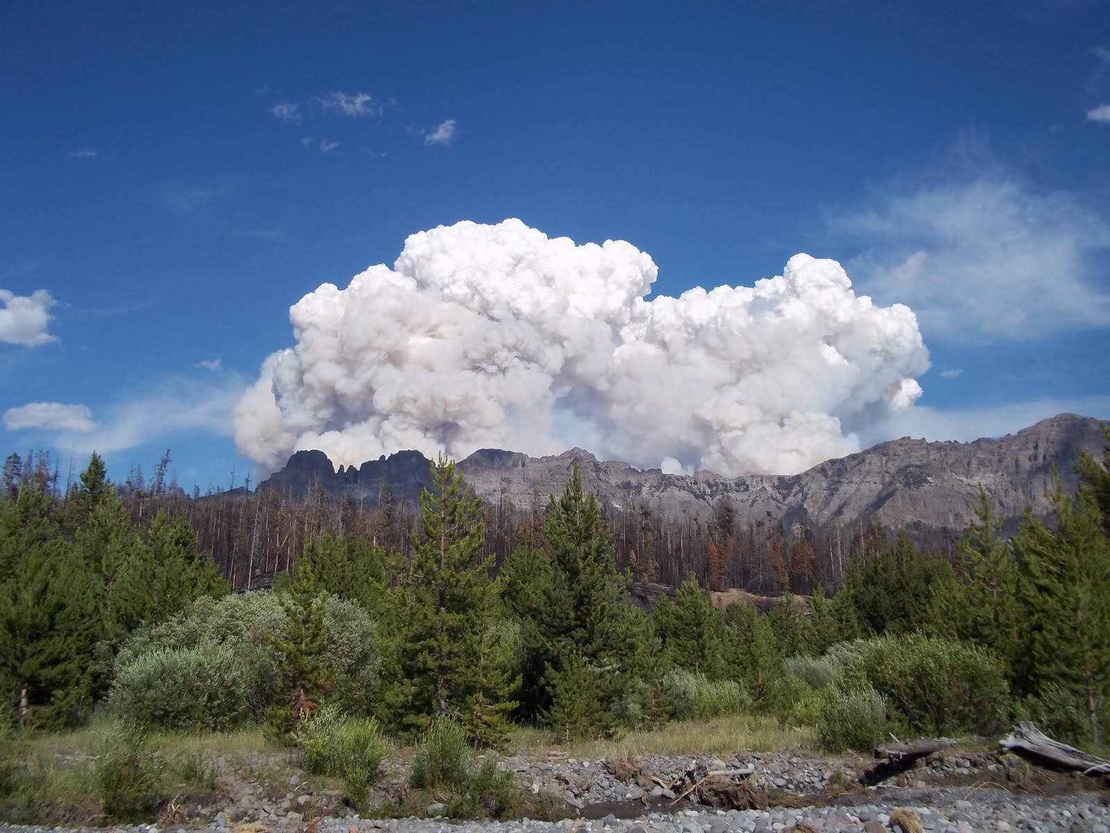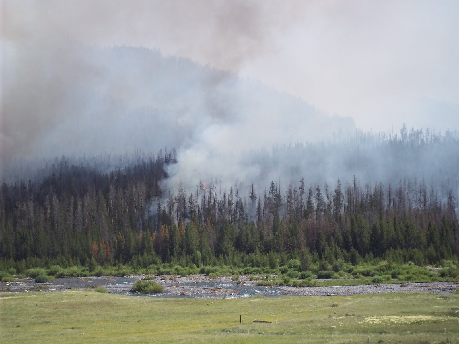 The next morning I made three trips back and forth to the place where I’d left my wood and gear. I didn’t want to risk falling in again. Getting in the water even for a minute left my legs cherry red. There was nothing much to do the rest of that day (Monday) except watch the fire, since all the trails but Frontier Creek were closed, so I said goodbye to the fishermen and got some advice from Earl on other places south along the river to look for wood, and that’s where I headed. The fire was just starting to spread north along Frontier Creek, so that meant it would eventually jump the creek and spread along the western side, where the campground was. The firefighters were trying to save the cabin and the campground, but otherwise letting the fire go. The Nebraska folks were hoping to stay, but I figured Frontier would be closed soon (and it was). They had plans to be at Double Cabin a week and didn’t have any other options set up. Depending on the wind, you were either getting a wonderful view of the huge column of smoke and trees bursting into orange flame, or you were in the middle of the smoke with watering eyes.