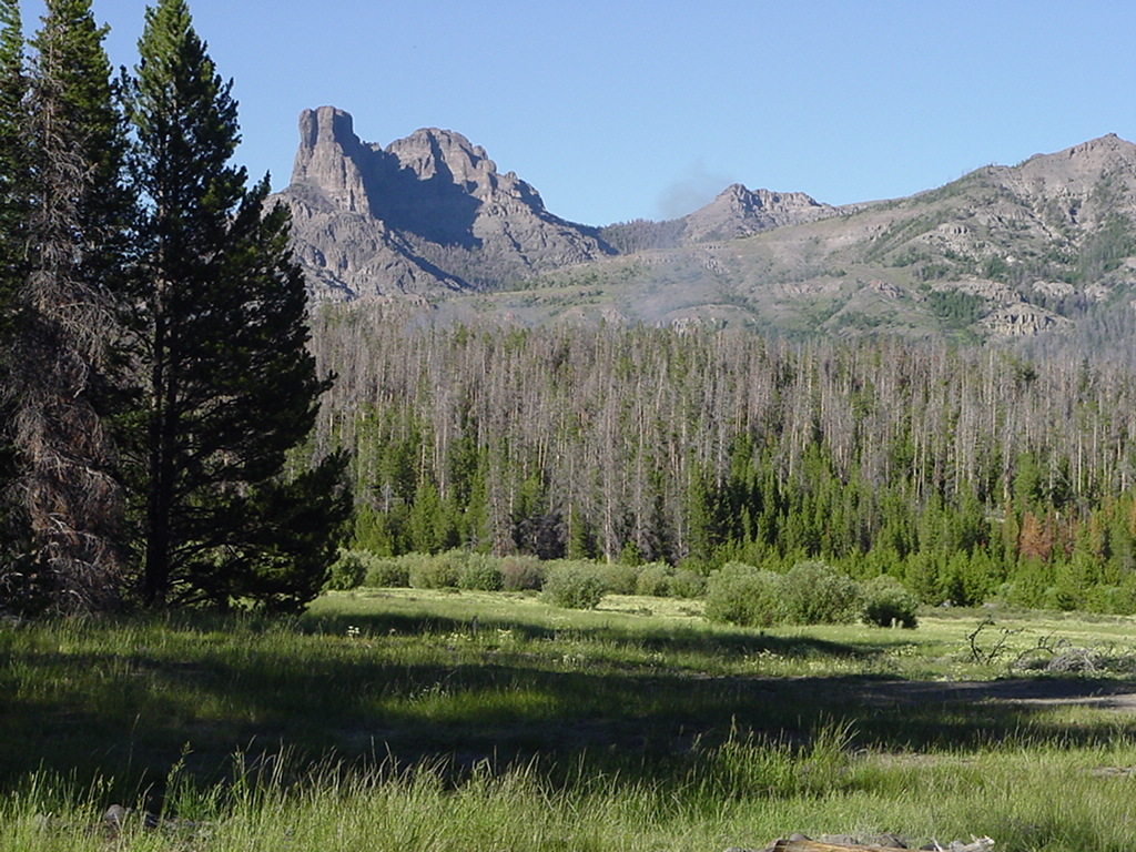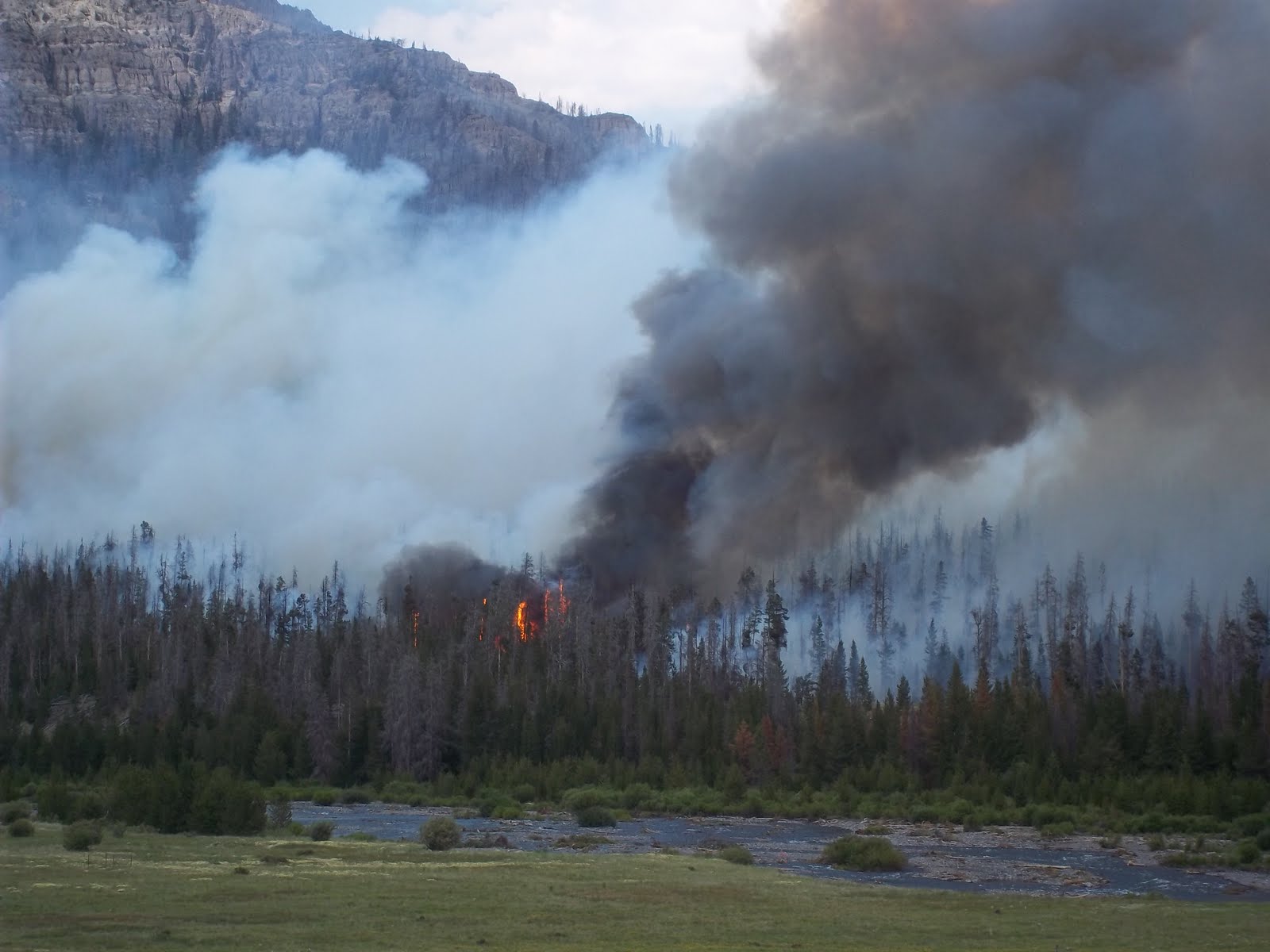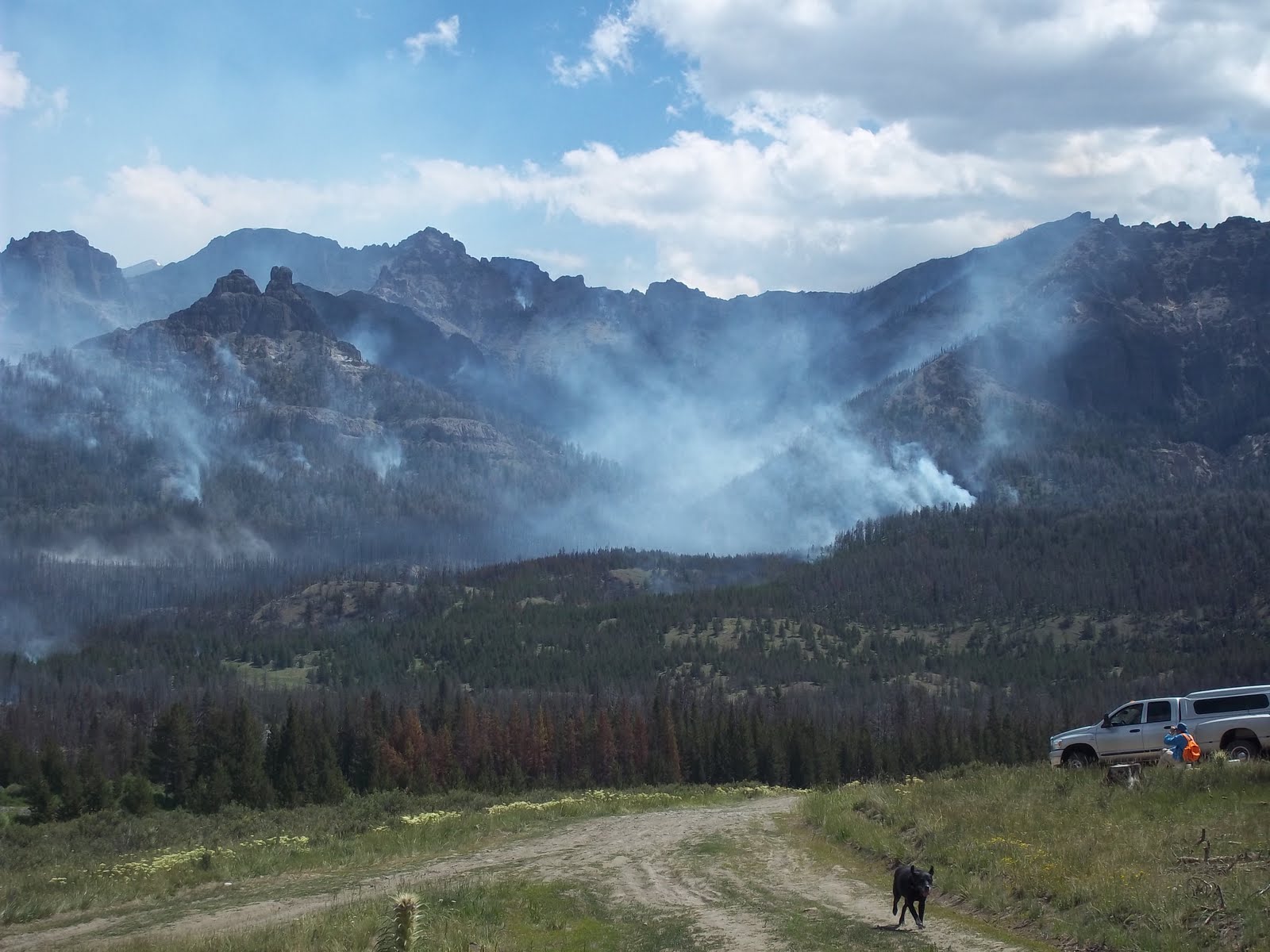 The next morning I made three trips back and forth to the place where I’d left my wood and gear. I didn’t want to risk falling in again. Getting in the water even for a minute left my legs cherry red. There was nothing much to do the rest of that day (Monday) except watch the fire, since all the trails but Frontier Creek were closed, so I said goodbye to the fishermen and got some advice from Earl on other places south along the river to look for wood, and that’s where I headed. The fire was just starting to spread north along Frontier Creek, so that meant it would eventually jump the creek and spread along the western side, where the campground was. The firefighters were trying to save the cabin and the campground, but otherwise letting the fire go. The Nebraska folks were hoping to stay, but I figured Frontier would be closed soon (and it was). They had plans to be at Double Cabin a week and didn’t have any other options set up. Depending on the wind, you were either getting a wonderful view of the huge column of smoke and trees bursting into orange flame, or you were in the middle of the smoke with watering eyes.