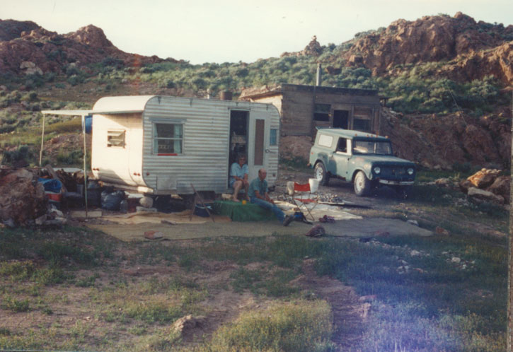 I eventually decided to build a cabin on the Christine Marie. There was really only one good spot to do this. There was a very large rock on a flat area just a few yards off the road. The back side of the rock was relatively flat and about 7 feet high. The flat side would be the back wall of the cabin and the rock would support the roof. I had no money to spend on building a shelter so I started gathering things I could use. I, of course, had lots of big rocks so I moved several of them that had nice flat sides close to the larger rock with the loader. I found 4 long poles left over from building a coral half buried in the desert and dragged them to the upper cabin with the Scout. Getting them down to the Christine Marie was an adventure worthy of “America’s Funniest Home Videos.” Back in Wisconsin at The Gem Shop we had replaced several glass counter tops because they were scratched. These were packed up and brought out to the mine to use for windows.