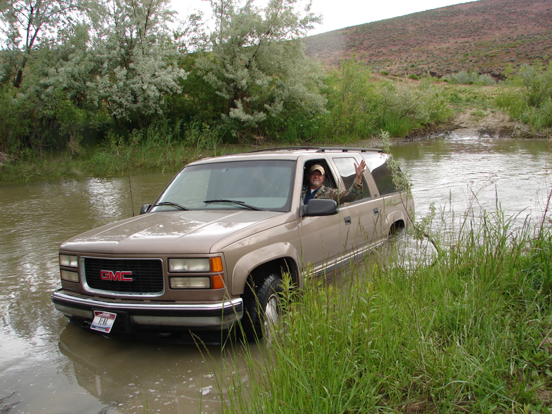The morning broke gray and windy with no rain. This was encouraging because the wind dries things out fast in this treeless country. We dug a few drainage ditches from around the wheels of our vehicles, put some rocks in the mud for traction, and waited. The sky was threatening rain again, but it did not rain, and about noon we decided to try again. After a couple of adjustments we were moving. The road improved some with rocky stretches between mud holes. Mud holes are not too hard to get through as long as there is hard ground on the other side – although, it is somewhat trickier when you are pulling something. The technique is to have the proper momentum and still allow for maximum traction. We made it to the corral and were feeling optimistic that we could make the last 4 miles when it stated to rain again. The road from the corral to the rim is so rocky that speed cannot be used to your advantage in the mud. The only way to drive this part of the road is slow whatever the conditions. We made it up the little rise after we went through the gate, down a shallow draw, and around onto the side of a gently slopping hill where Jake’s truck and trailer slowly slid off the road and got stuck. I was a little further back and still had some traction. I saw a place where I could get off the road, pulled up in the sagebrush, disconnected my tailor, maneuvered my truck in front of Jacks rig, chained our trucks together, and proceeded to throw mud everywhere with our spinning tiers to no avail. After some consideration we resolved to spend another night in the mud and hope again for a better tomorrow.