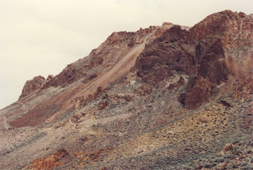 This rock is very abrasive. Because of the rock’s abrasiveness the rocks do not fall easily, but cling to each other. This quality contributes to the steepness of the area by not allowing rocks to erode downhill as fast. To illustrate this, it is possible to take two flat pieces of this welded tuff, place one on top of the other and tilt the pair of rocks almost 80 degrees before the top rock will fall off. Try this with most other rocks and the top rock will start to slide off with a tilt of a little over 45 degree