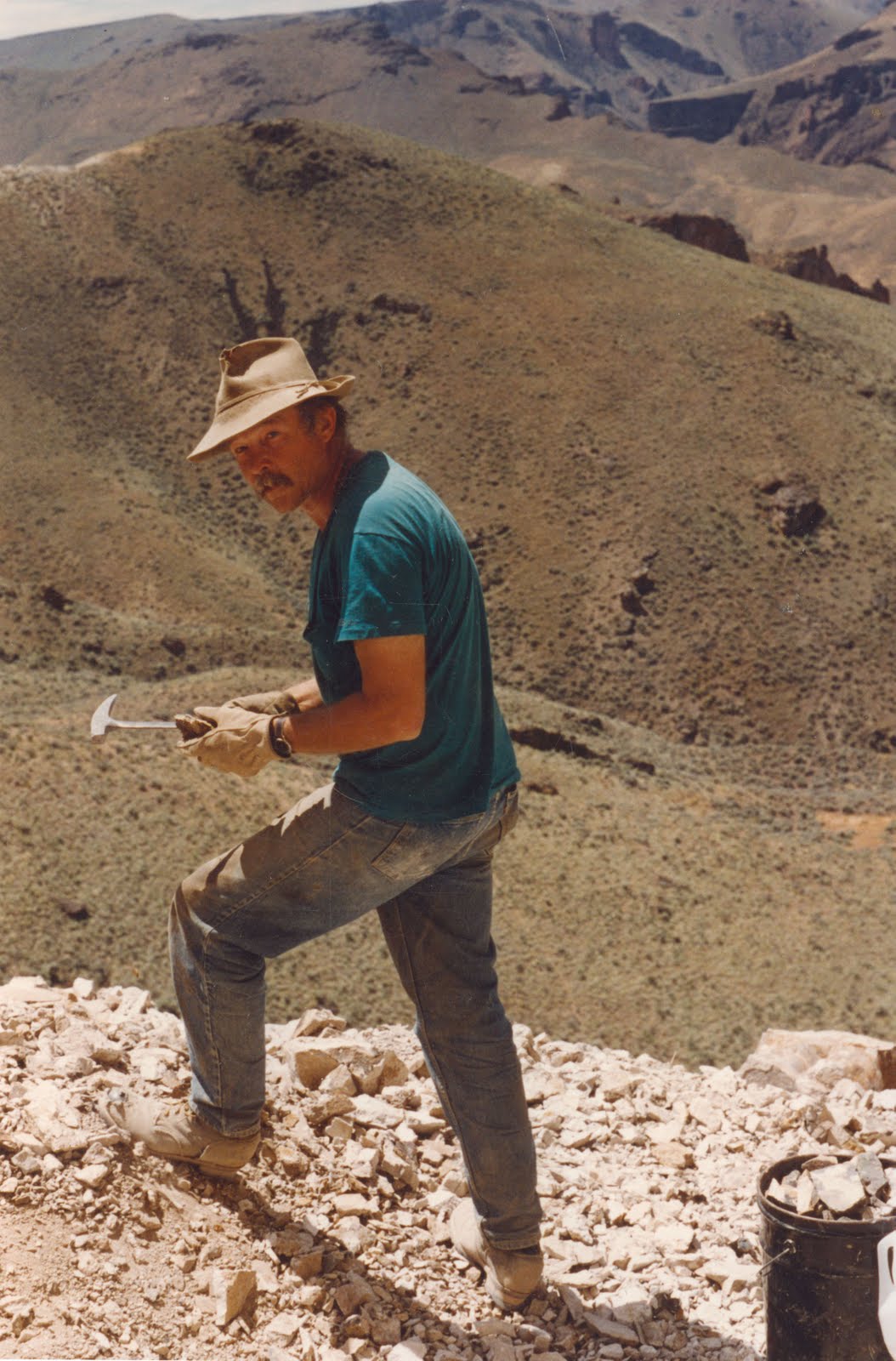 Jake and Tom drilled 12 foot holes with Tom’s 80 pound hand-held sinker drill, filled the holes with explosives, and broke up the rock. They then used both frontend loaders to push the barren rock over the edge as they worked down the side of the steep hill towards the deposit. They did this over and over for about three weeks without getting any jasper. About this time Jake moved back to mine Bruneau where he knew he could produce rock he could sell easily.
