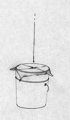 I didn’t – and still don't – usually include a bunch of mouse traps with my mining supplies, and store-bought traps are not be very effective anyway. Jake taught me how to build a better mouse trap out of materials often found in any mining camp. All you need is a 5 gallon bucket, a paper bag, some string or rope, and a little peanut butter. Put about 3 inches of water in the bucket. Stretch the paper over the top of the bucket and tie it on with string, rope, or wire. The trap should have a smooth surface like a drum but does not have to be as tight. With a sharp knife make two straight right angle cuts in the paper all the way across the covered surface of the bucket. These cuts should cross in the middle of the bucket (see drawing). Where you put the trap does not matter – the mice will find it. However, a string must be hung directly over the center of the bucket. The string should end about three inches above the surface of the paper and be liberally coated with peanut butter. You must also provide a ramp for the mice to get to the edge of the bucket. Any old piece of wood, cardboard, or pile of rocks will work. A mouse will smell the peanut butter, climb up on the edge of the bucket, step onto the paper stretched over the bucket with water in it, fall in, and drown.