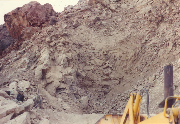 I remember walking to the mine wondering how I was going to do any work in the heat. There was no breeze or air movement as I started down the slope into the pit. To my surprise the air felt a little cooler. I could not believe how cold it was in the bottom of the pit. I went over to the large cracks between the big rocks in the bottom corner of the pit and I could feel cold air coming out of the cracks. Without a breeze to carry the cold air away it had filled up the pit like a lake. I told Jake about the cold air and we found a thermometer to check the temperature. We placed the thermometer in one of the cracks and no matter what the weather or time of day, the air seeping out of the cracks remained a constant 39 degrees. The cracks between the rocks were large enough to accommodate water bottles and for a long time I always has cold water to drink while working. It was still hot working if there was a wind dissipating the cold air, but you could at any time get down close to the cracks and cool off. As to why there was cold air coming out of the cracks, I have no idea. Perhaps there is some ice down in the earth under all the severely cracked rock.